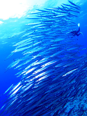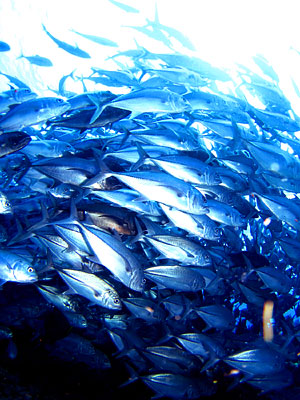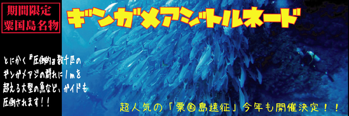 那覇から粟国島・渡名喜島へ、期間限定「遠征ダイビングツアー」。ギンガメアジの大トルネード、芸術的な光を浴びる絶景の地形ポイントなど、慶良間の海とは一味も二味も違った、沖縄の海の底知れない魅力を充分に満喫できる、シーサー那覇店大人気のダイビングツアーです。