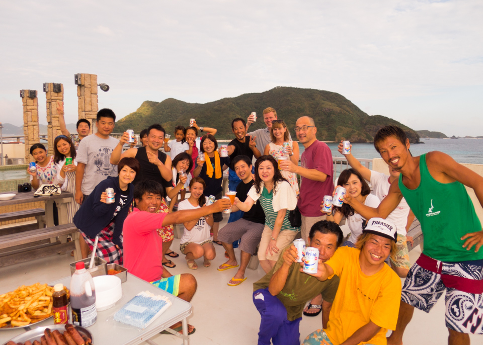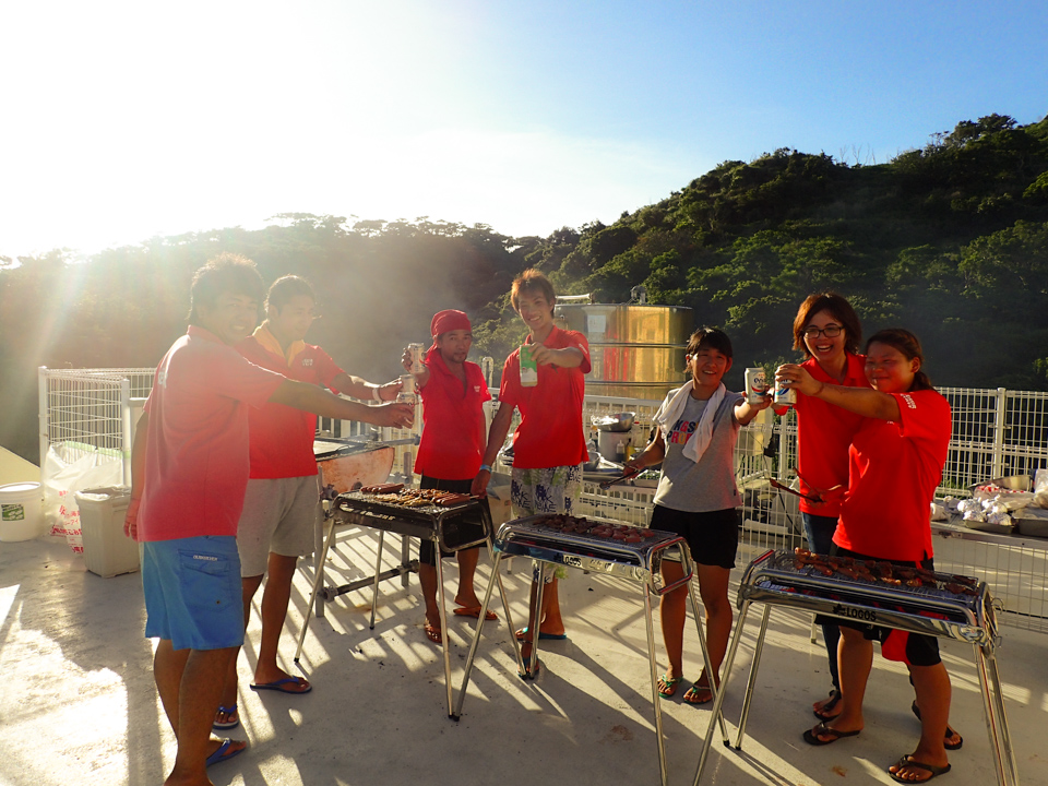 夕食とログ付けを兼ねて、シーサーの屋上でBBQを開催します。