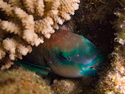 ブダイはエラからだした粘液をうすい膜にして、からだを包んで寝ます。寝るときに体の模様や色をかえる魚もいます。いつもと違う色にビックリ!