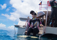 まずは那覇・泊港から船で阿嘉島へ!阿嘉港ではスタッフが赤い看板を持ってお迎えします。お店到着後、受付・ウェットスーツのお渡し。