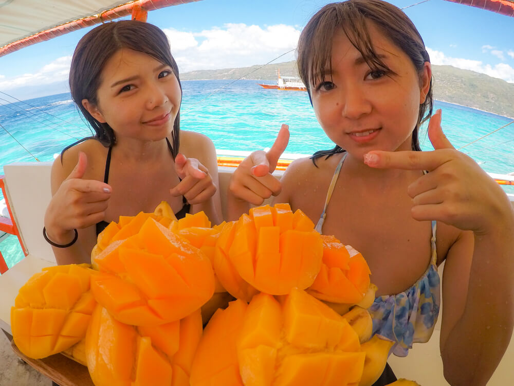 休憩時間にマンゴーを食べたらツアー最後のダイビング!最後は体のことを考え、浅目に潜って楽しみます。