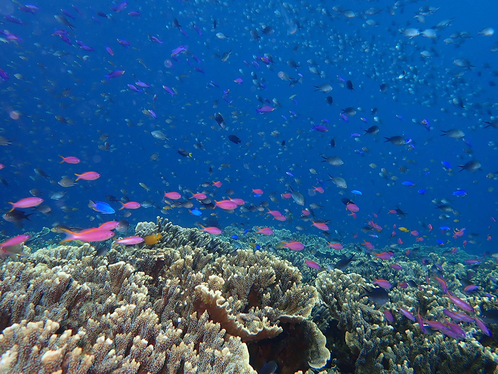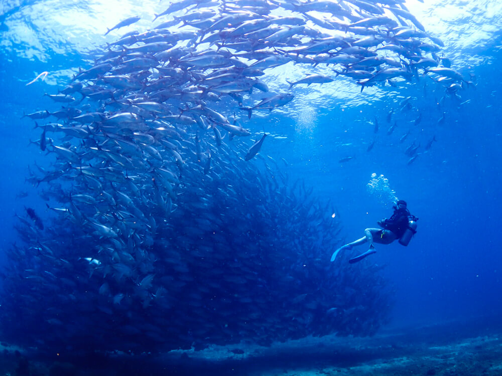 ロウニンアジの群れやギンガメアジの群れ、体を覆い隠すほどのデバスズメの大群など、多くの魚種、魚影と出会うことができます。