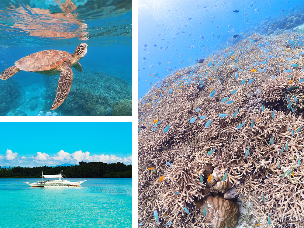 見渡す限りに覆われた美しいサンゴ群。そして巨大なウミガメに出会うことができるでしょう。
