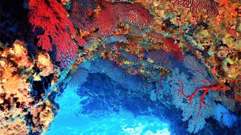 the red corals, sea goldies and the lights filtering through the rocks make for a most mesmerizing seascape.