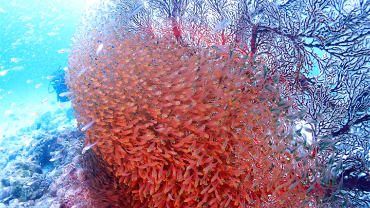 Admire thousands of swallowtail cardinalfish and blue green damselfish swimming around the corals.