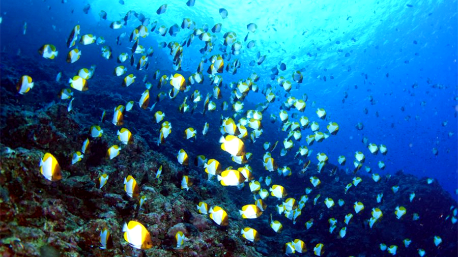 群聚在枝狀珊瑚間的水藍色雀鯛。當他們受到驚嚇時會同時躲進珊瑚的縫隙裡,躲藏的模樣也意外形成了一抹美麗的風景。