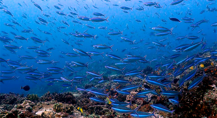 透明的小魚群常聚於珊瑚根部。 如果仔細觀察,通過牠們半透明的身體,甚至可以看到骨頭,而他們的身體因陽光折射,會發出閃爍光芒。