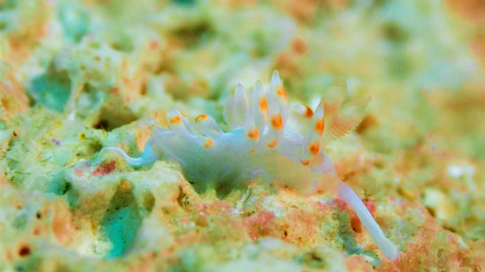 體長約1厘米的偏白色。在海蛞蝓家族中屬於移動速度偏快快的種類,因此拍攝時的對焦時機較難掌握。