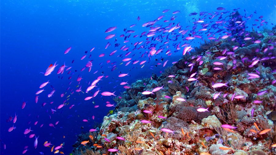 鮮豔藍紫色的擬花鮨。以雄性為首會形成一個“後宮”的社會型態。而雌性也會經歷由雌轉雄的性別變化。