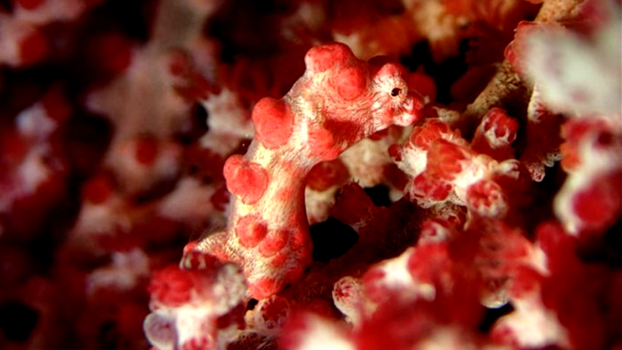 體積只有1㎝左右。會在水深20m的地方發現牠們,通常會附著在粉色珊瑚上,擬態成像樹枝一樣來保護自己。