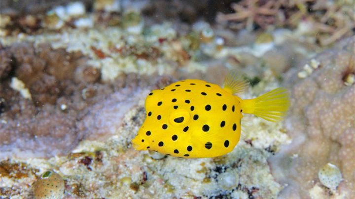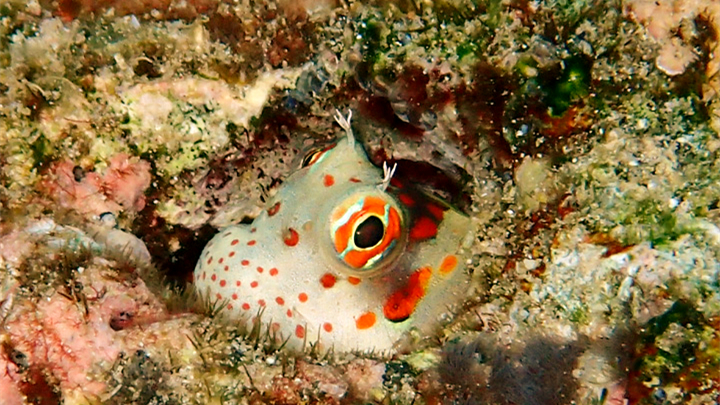 住在淺海岩洞中的鳚科魚類。臉上的橙色圓點非常吸晴,令人覺得可愛俏皮。