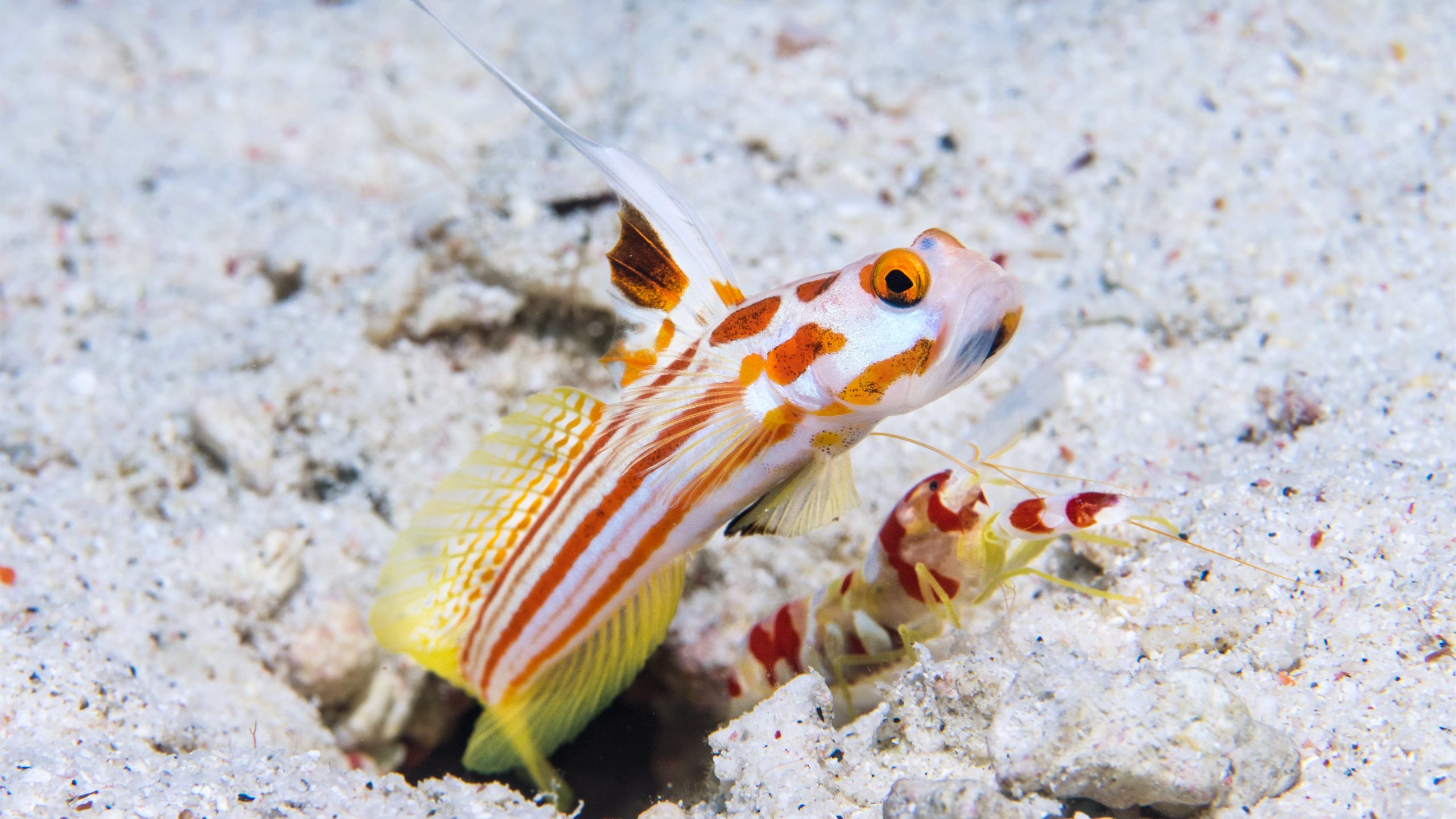 牠們的特徵是白色的身體上有橙色的線,擅長與在沙地上挖洞的槍蝦共存。警覺心非常高,一感覺到危險就會立刻躲進洞。
