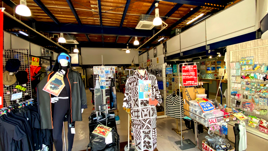 不僅販售專業潛水器材,也提供潛水防寒衣訂製服務,水上活動周邊產品如沖繩人氣的超防滑夾腳拖鞋或各品牌水下相機等等一應俱全。