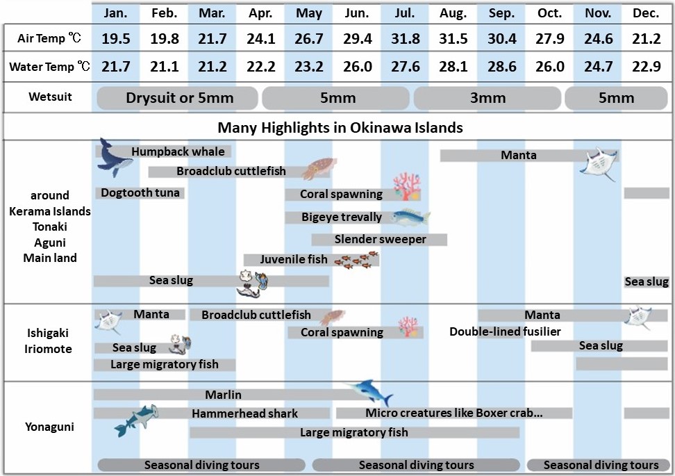 沖繩觀光淡季期,雖然冬季北風盛行,但比起陸地氣溫,水溫更加穩定。淡季時的住宿潛水也非常實惠,趁淡季考取潛水證或提升潛水證等級的絕佳期間。
