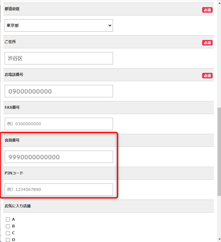会員番号の欄:②で確認したカードの会員番号を入力