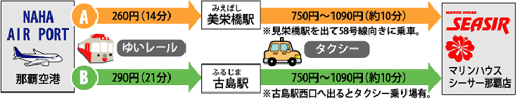 - A・Bはモノレール下車駅の違いです。いずれかの駅で降りて、タクシーにお乗り換えください(どちらも大差ありませんが、道路の混み具合によりBの方が早くつく場合もあります)。