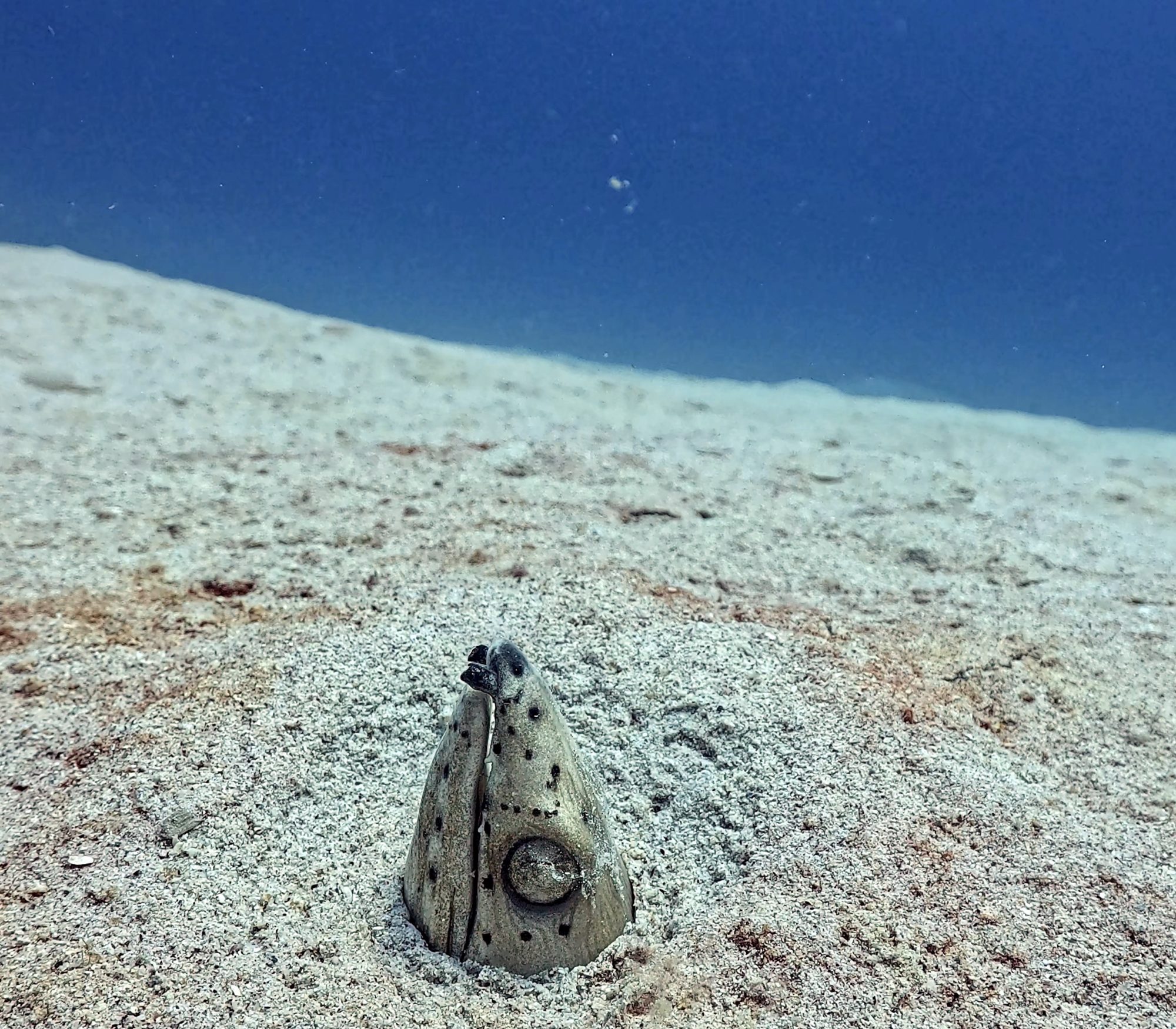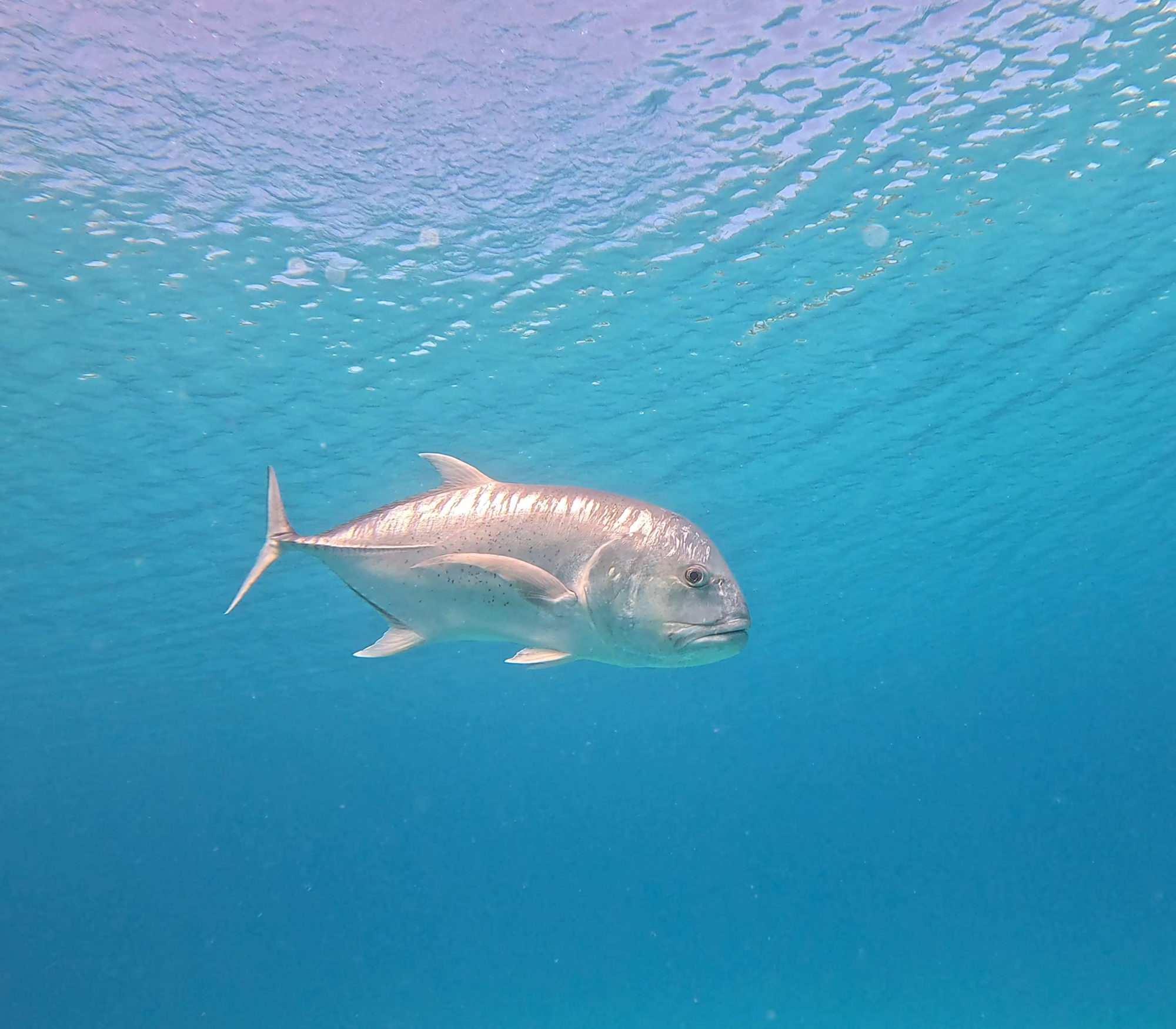 第三支潛點是ドラゴンレディ,一下去就看到一隻超壯的浪人鰺在給清潔魚做Spa,氣勢滿滿!接著整片的燕尾箭天竺鯛群在水中閃爍,還有一條筍鰻探頭偷看。回到礁石區的時候,一隻小章魚正在試圖躲起來,那專注的模樣真是又萌又有趣。