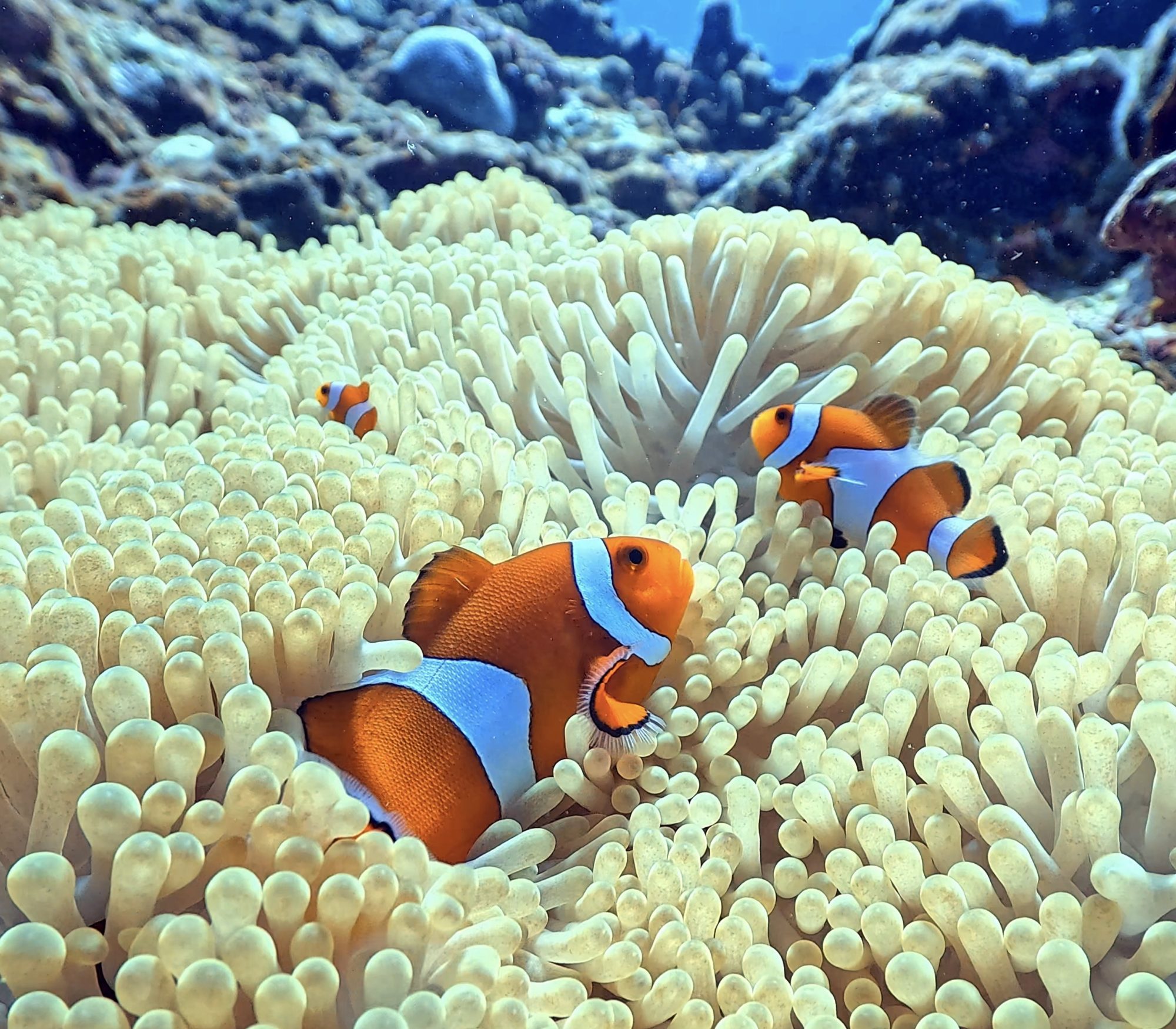 第一支在サンドラー,是經典的小丑魚潛點!今天一口氣看了五種小丑魚,連小丑魚的寶寶們也都在旁邊搖晃著超級可愛🐠。回程時還遇到一隻超大隻的玳瑁,正在認真吃飯中,嘴巴一開一合的樣子實在太療癒。