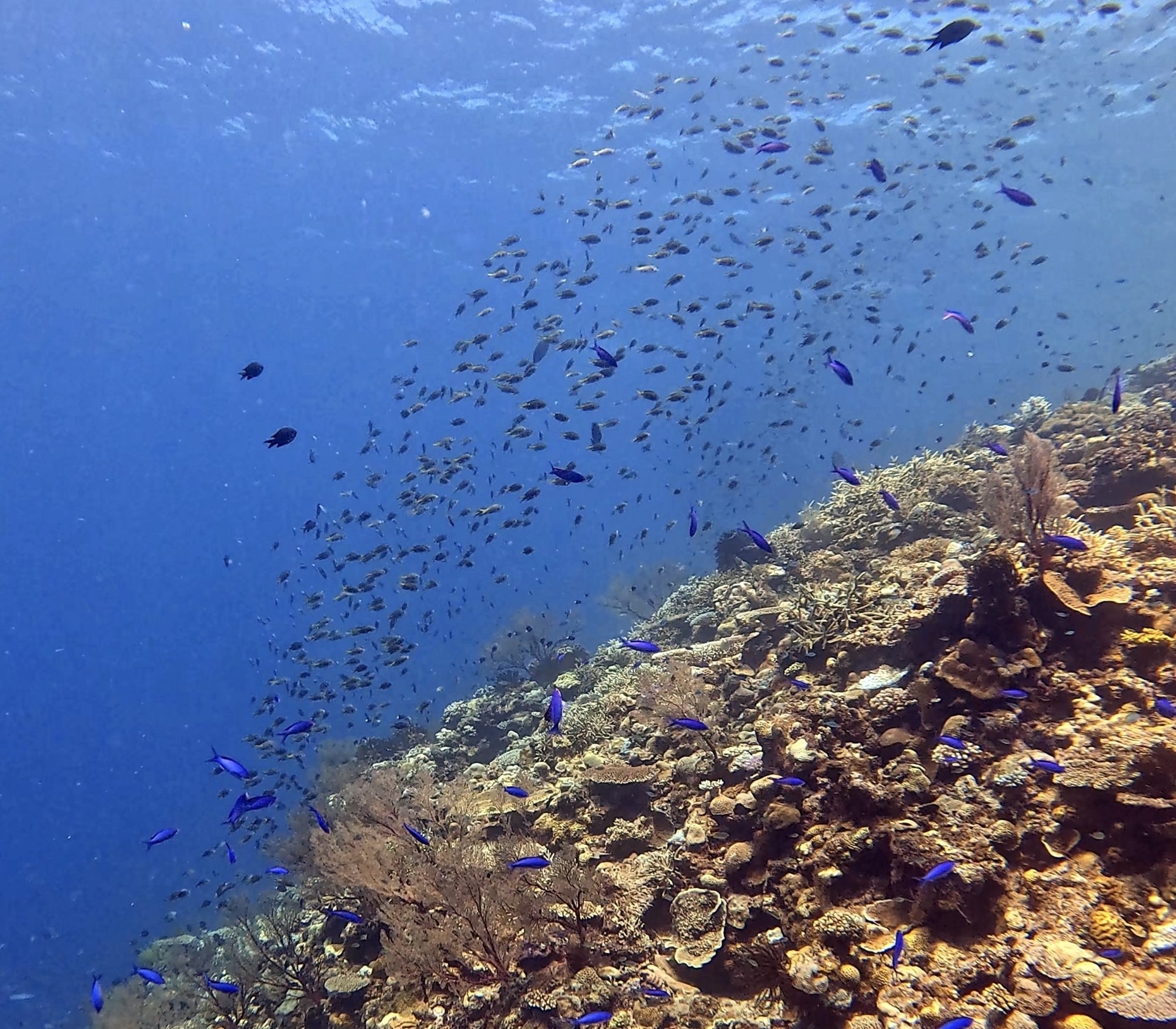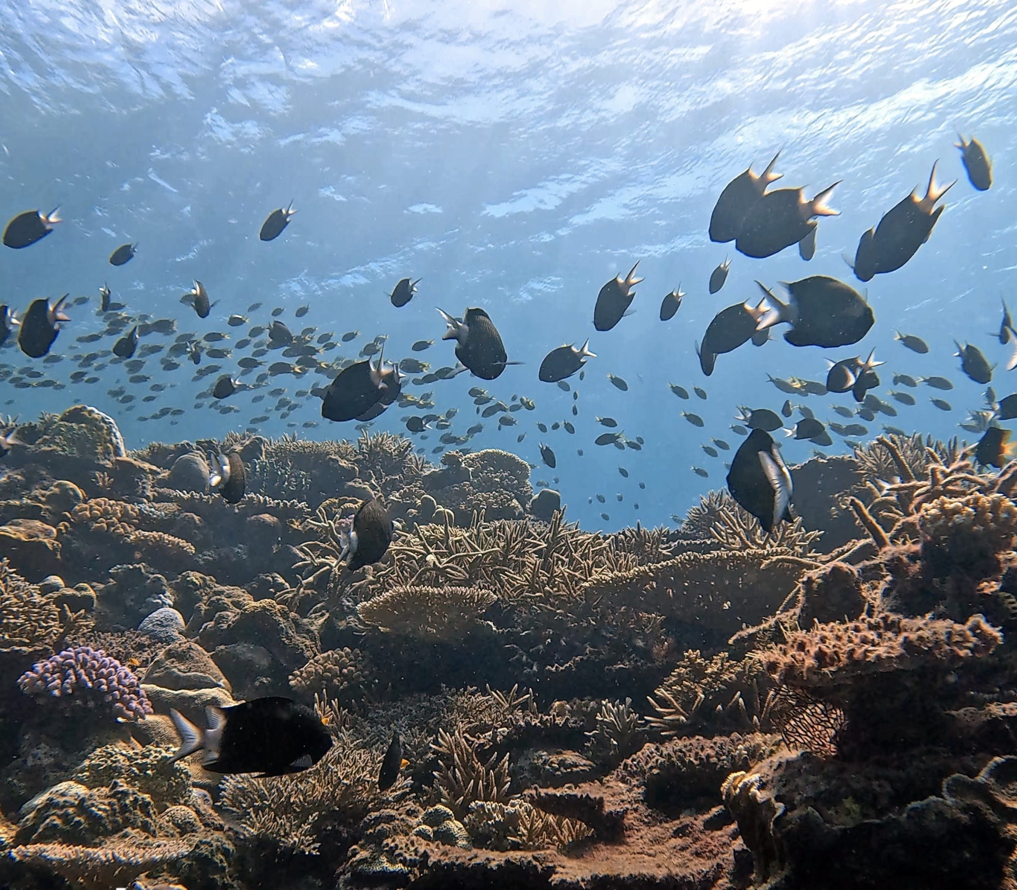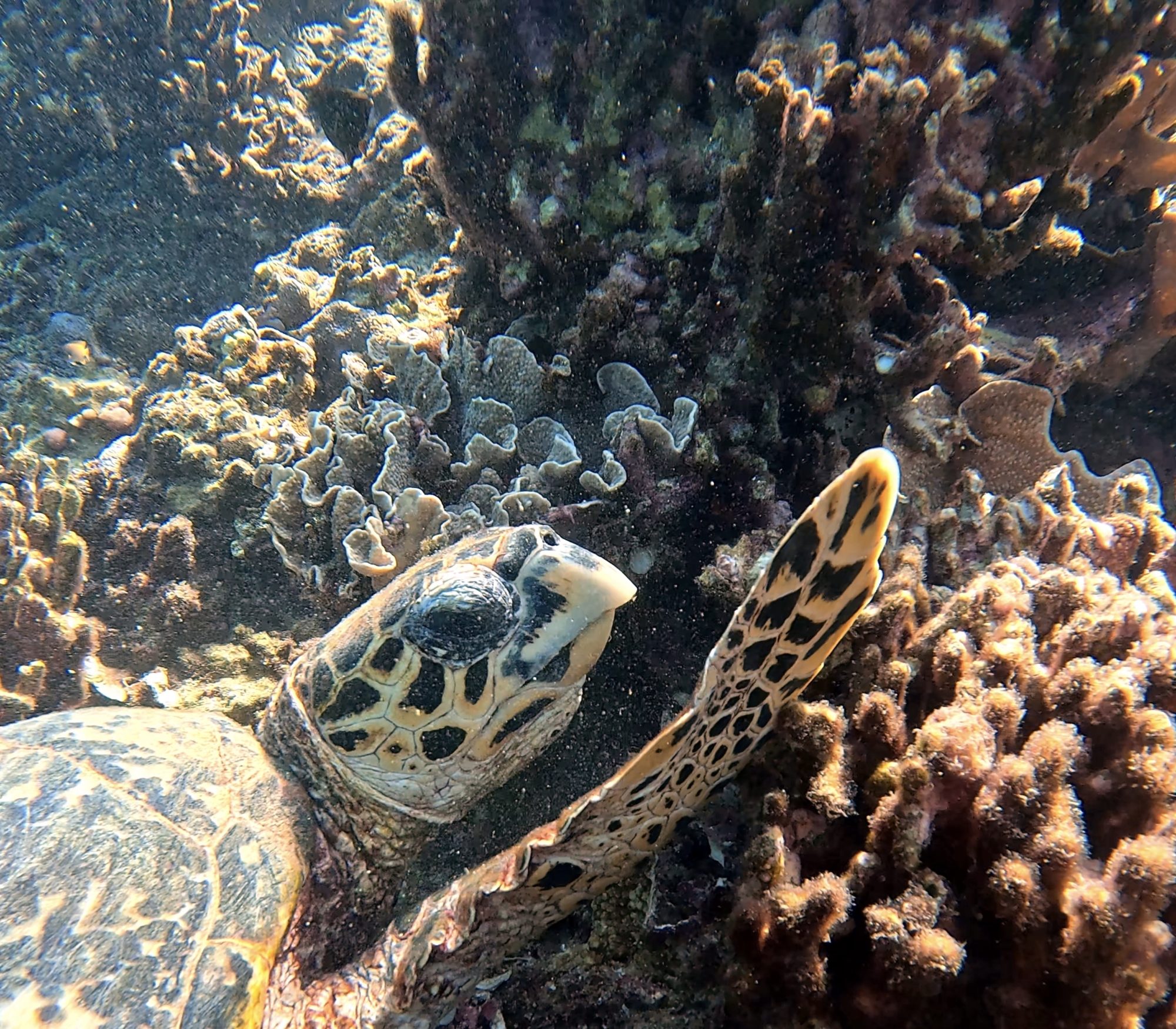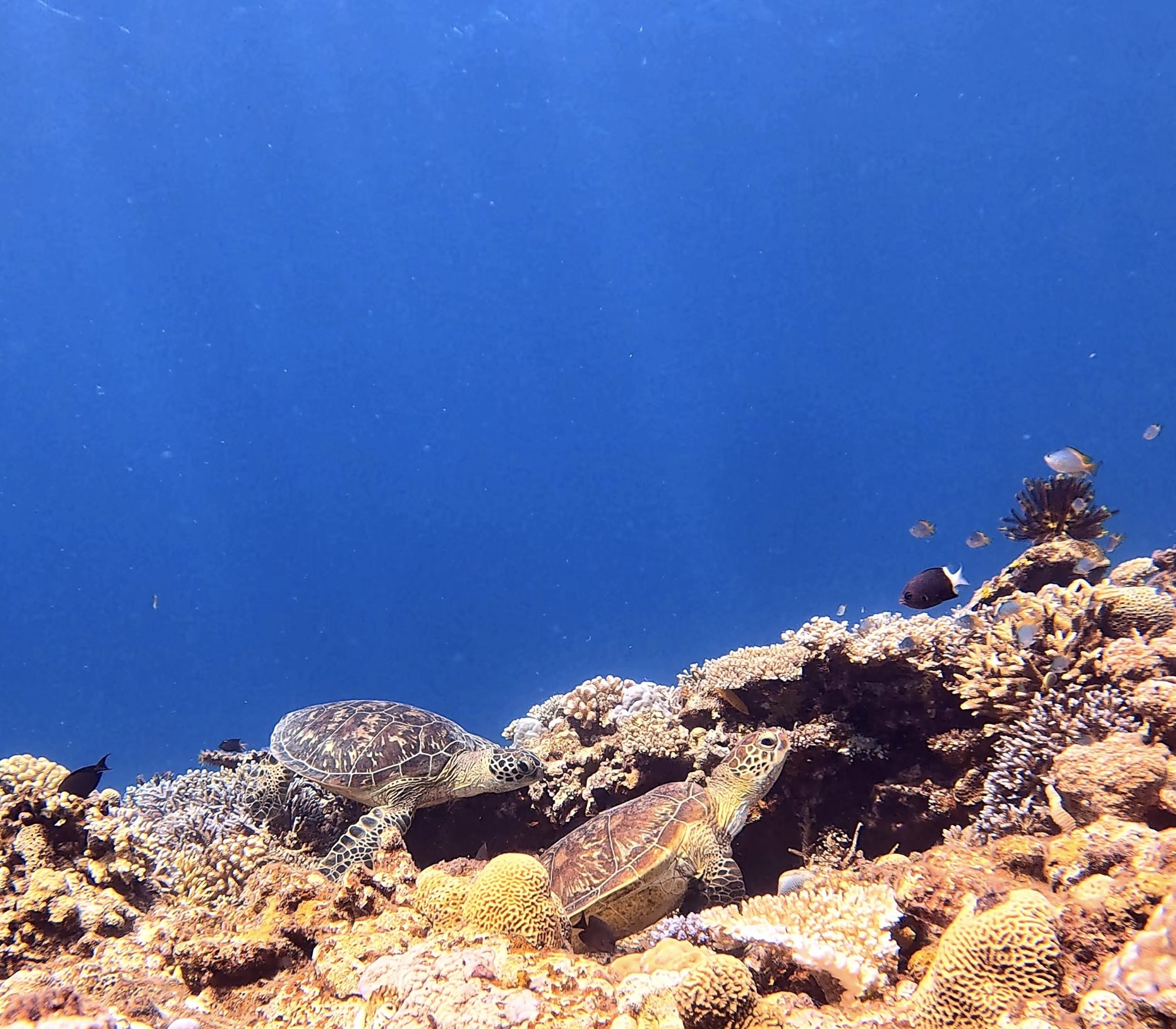 第二支到了アリガー,一下水就看到兩隻綠蠵龜在悠閒地休息。因為水流有點強,花園鰻只看了一下就繼續前進。沿途滿滿的雀鯛在珊瑚上閃著光,整個畫面像是被陽光灑亮的水中花園✨。最後還看到一隻綠蠵龜在用珊瑚抓癢,可愛到不行。