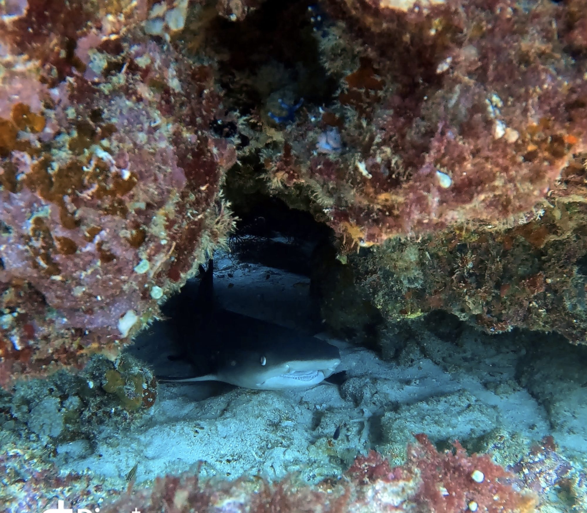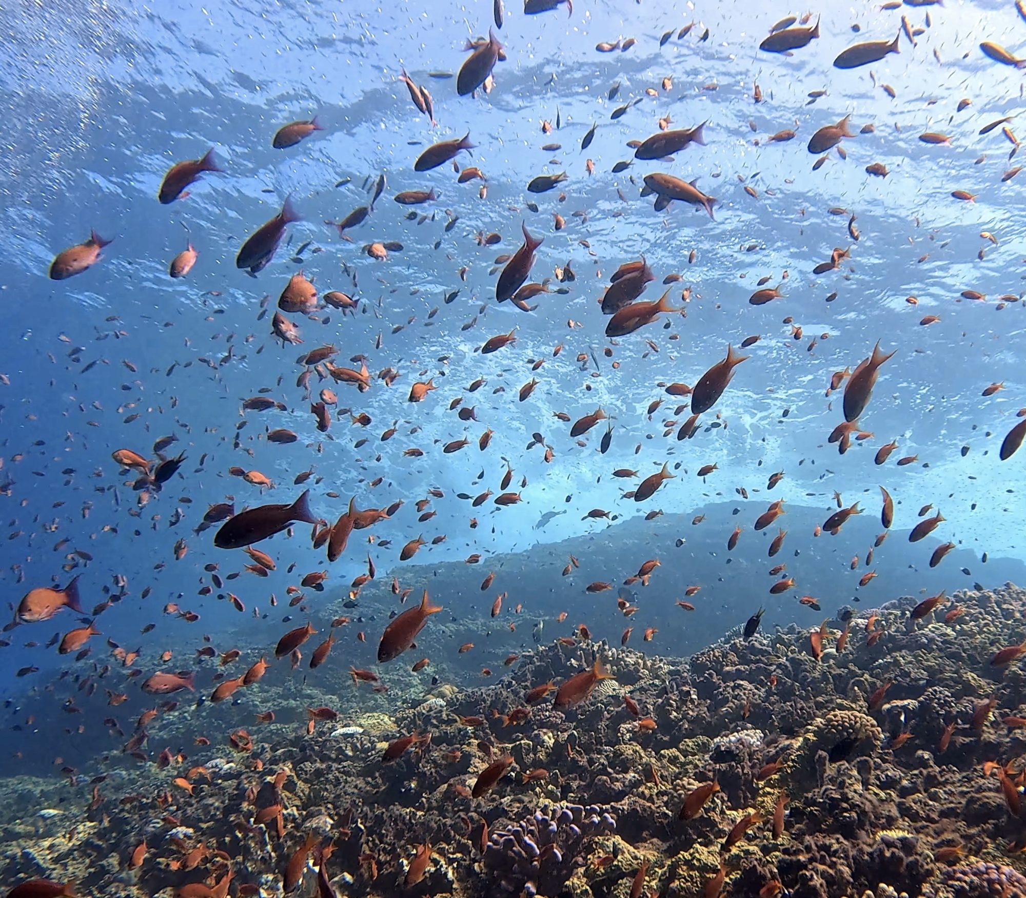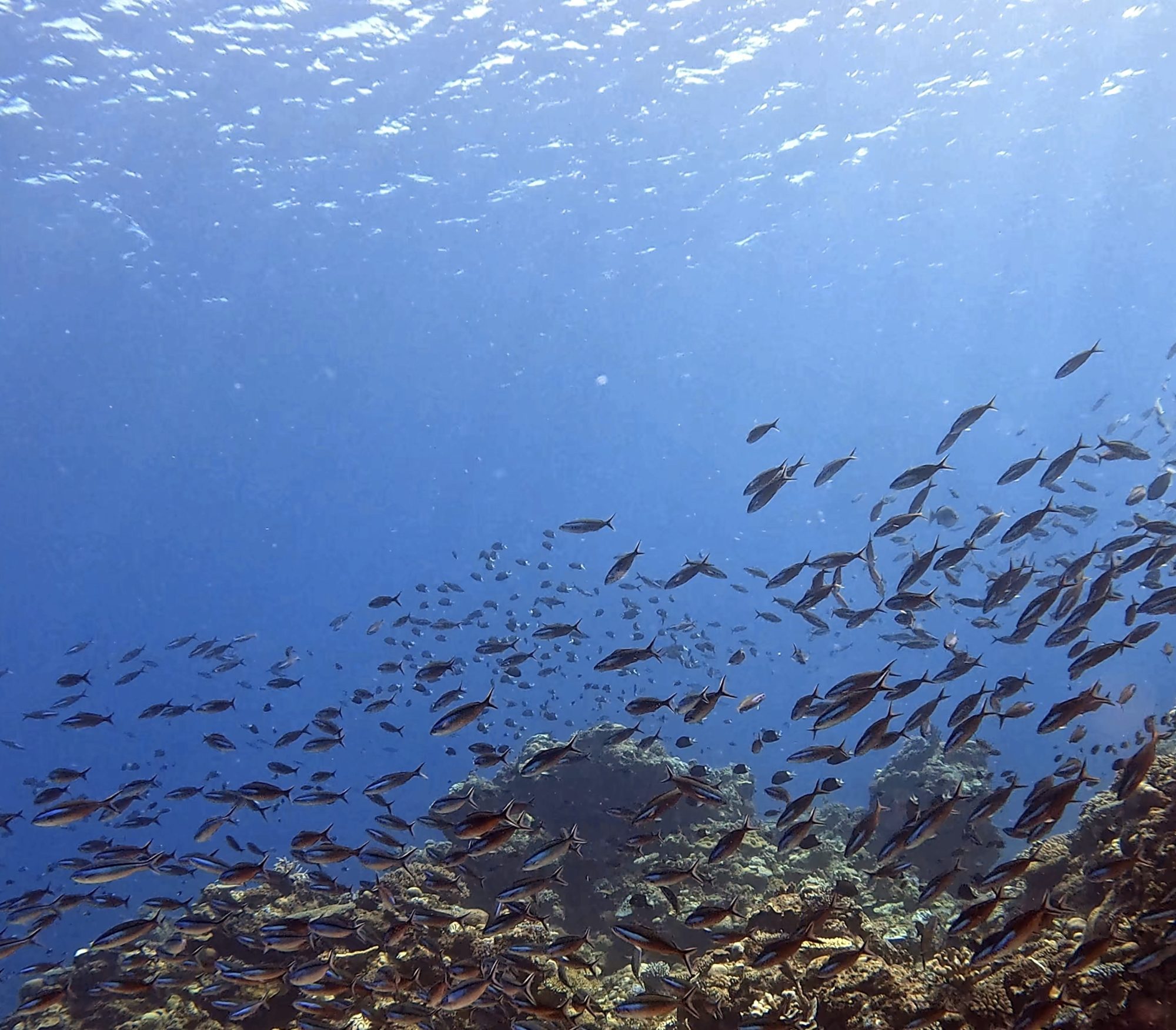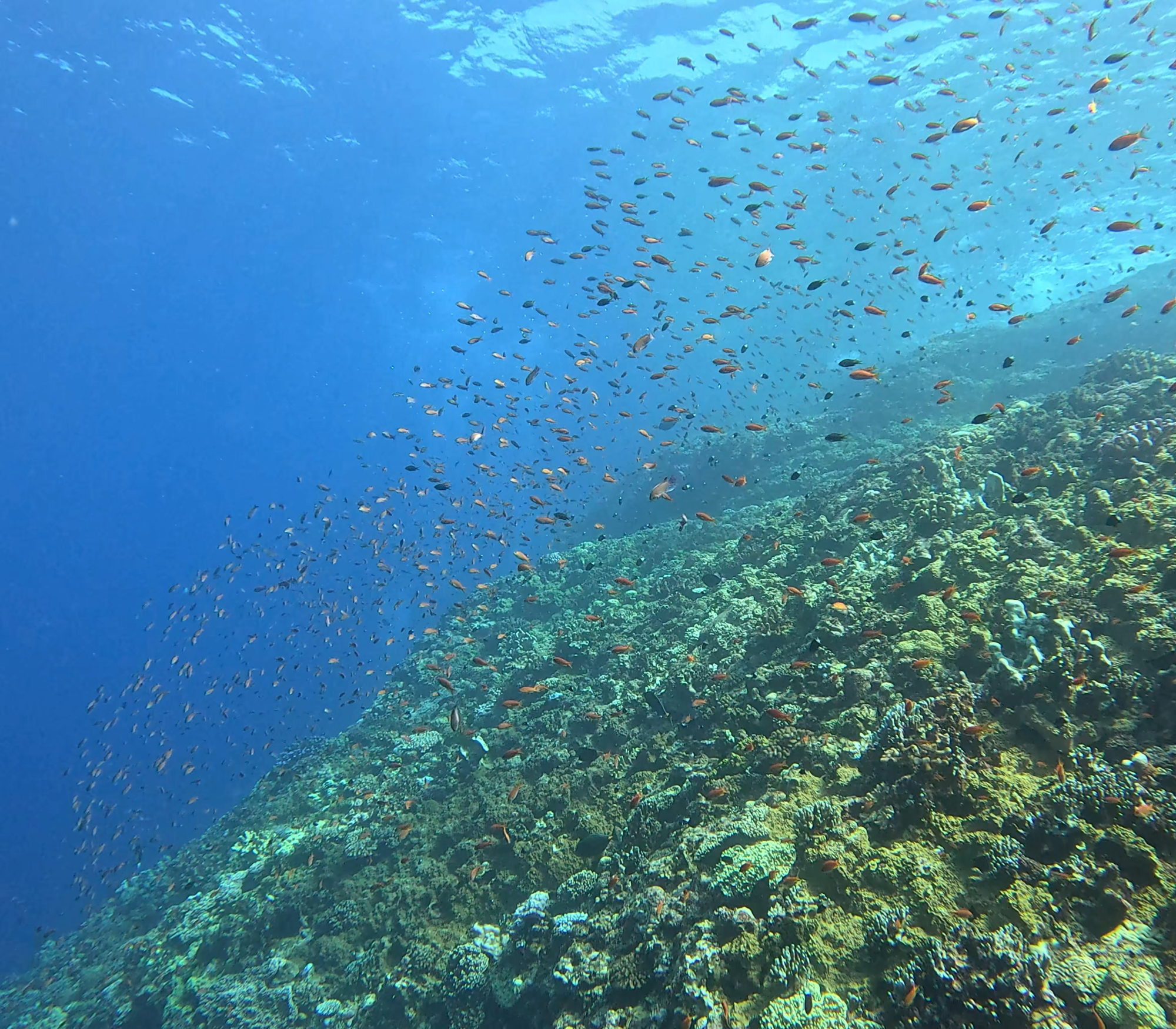 第一支在クエフ北,珊瑚綿延成片,雀鯛群在陽光下閃閃發光。遠處有兩隻鯊魚悠遊而過,還有一隻躲在礁石下休息。成群的雀鯛像是牆一樣圍繞,畫面非常壯觀。