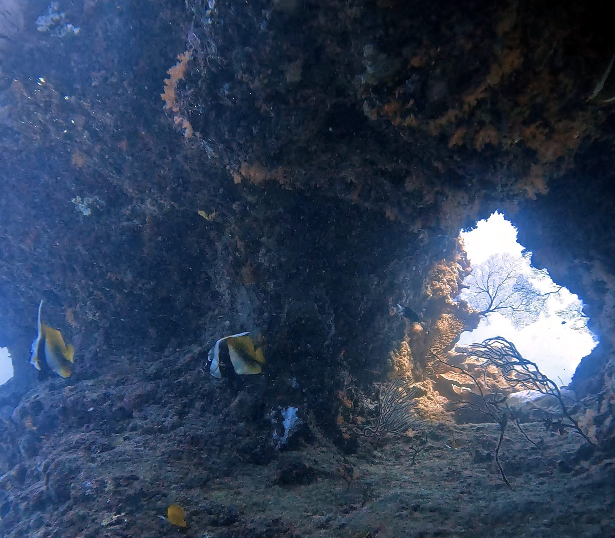 第三支上城則是最夢幻的一潛。海扇開在洞穴裡,從裡面往外看去就像天使的窗。出洞後,滿滿的短身光鰓雀鯛和雙帶烏尾鮗迎面而來,像在迎接我們離開夢境。