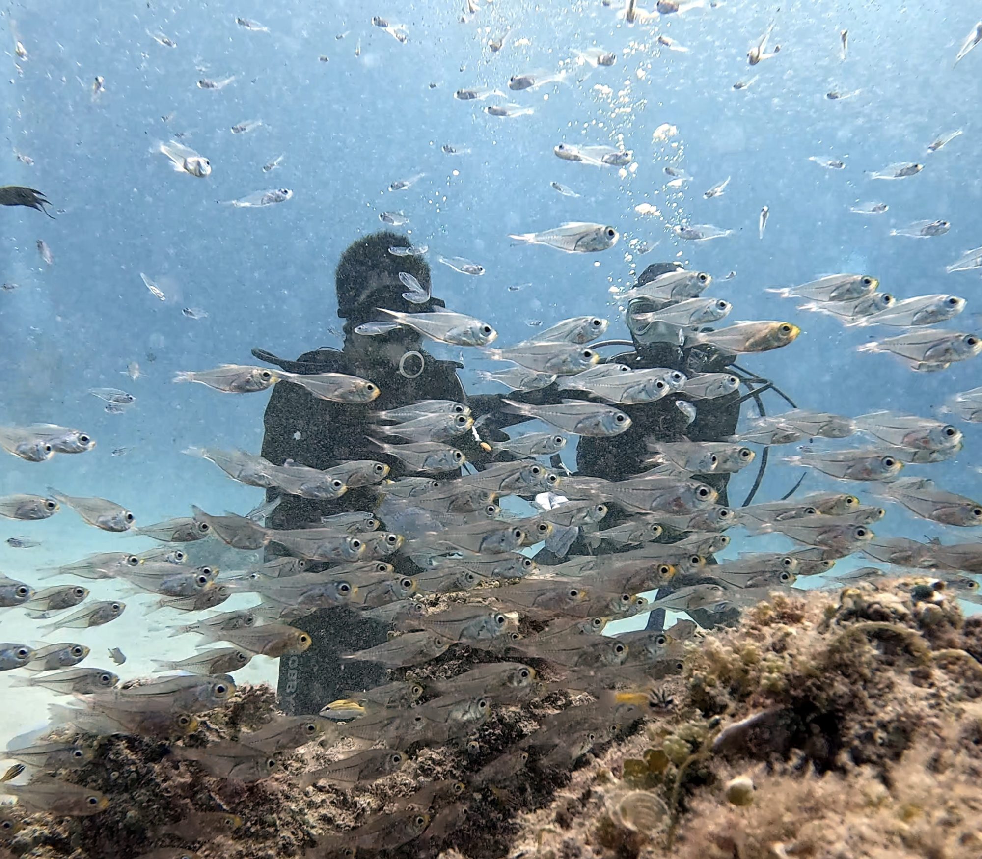 陽光穿過水面打在珊瑚上,雀鯛群閃閃發光,