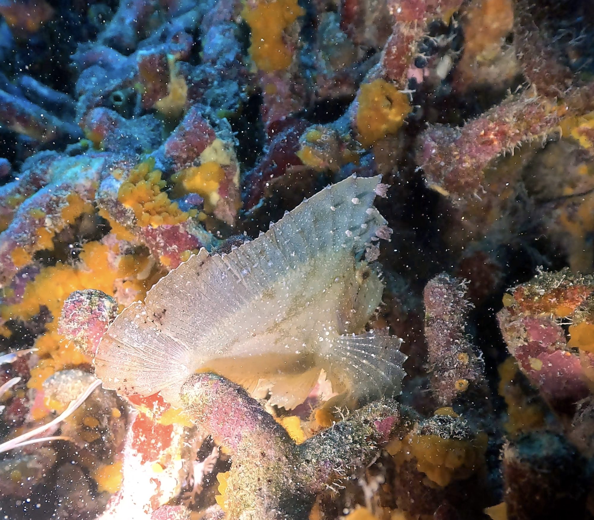 還發現了白色的石頭魚,藏得非常好,最後回程又遇上短身光鰓雀鯛和條紋豆娘魚的魚牆。