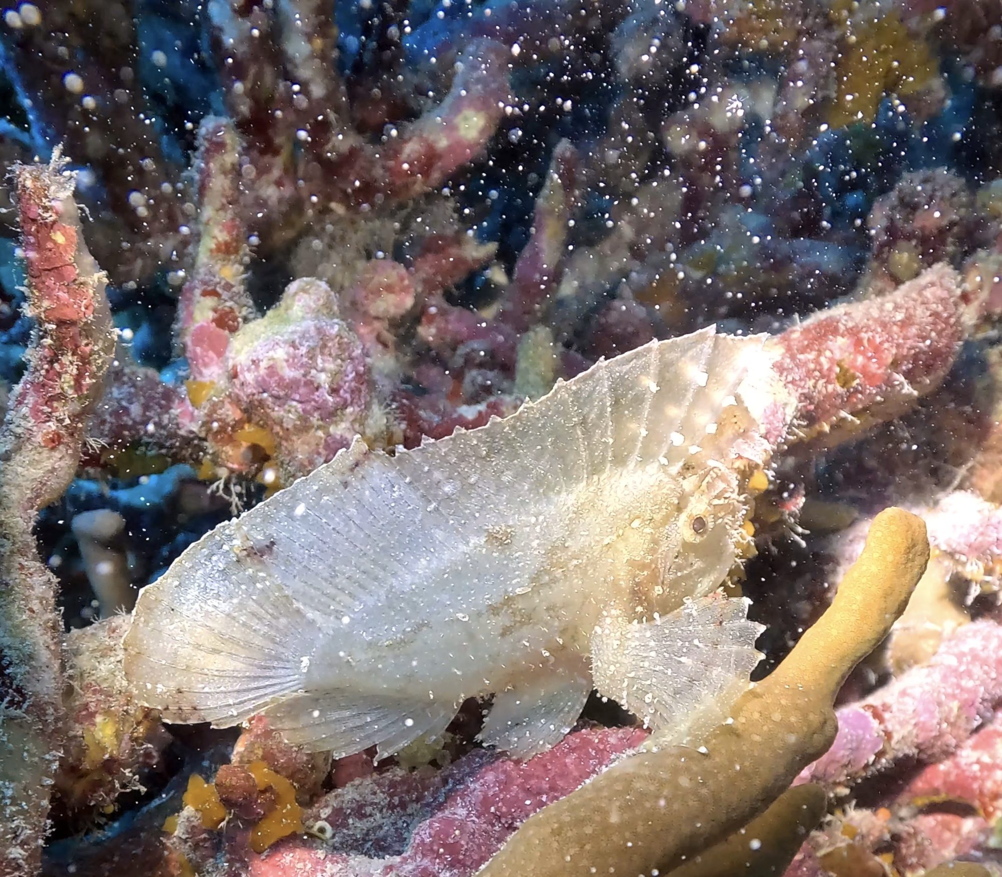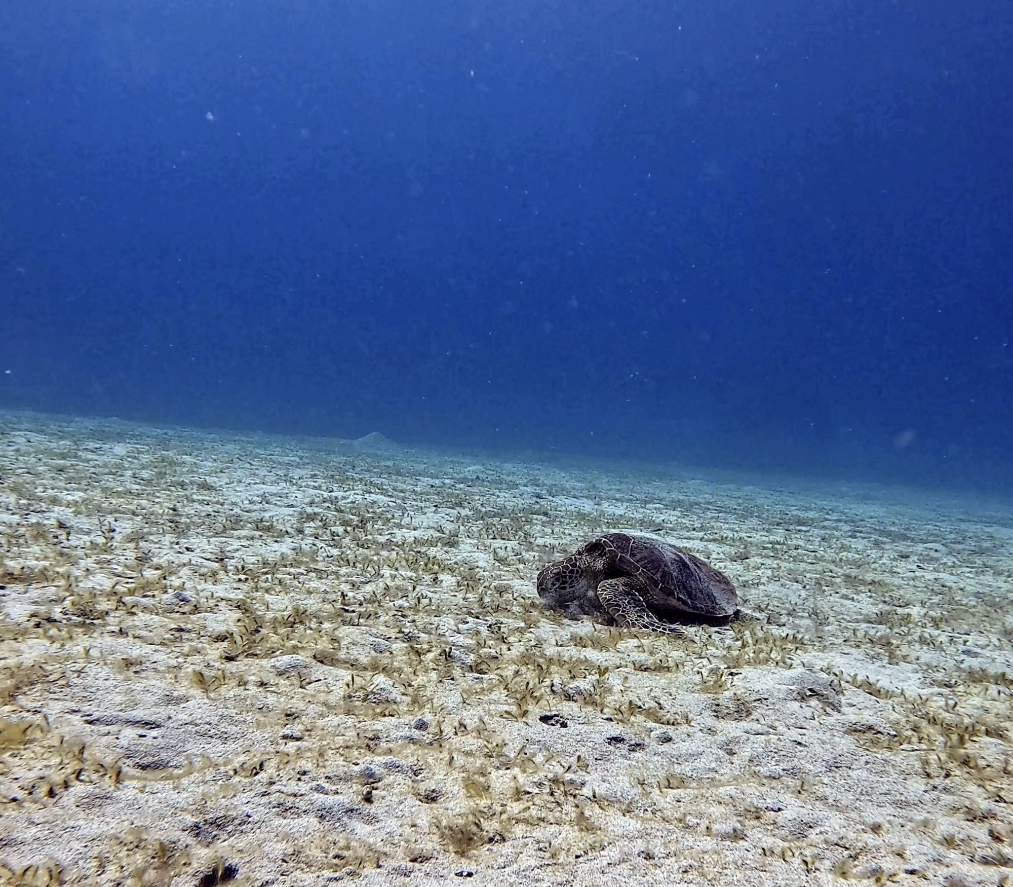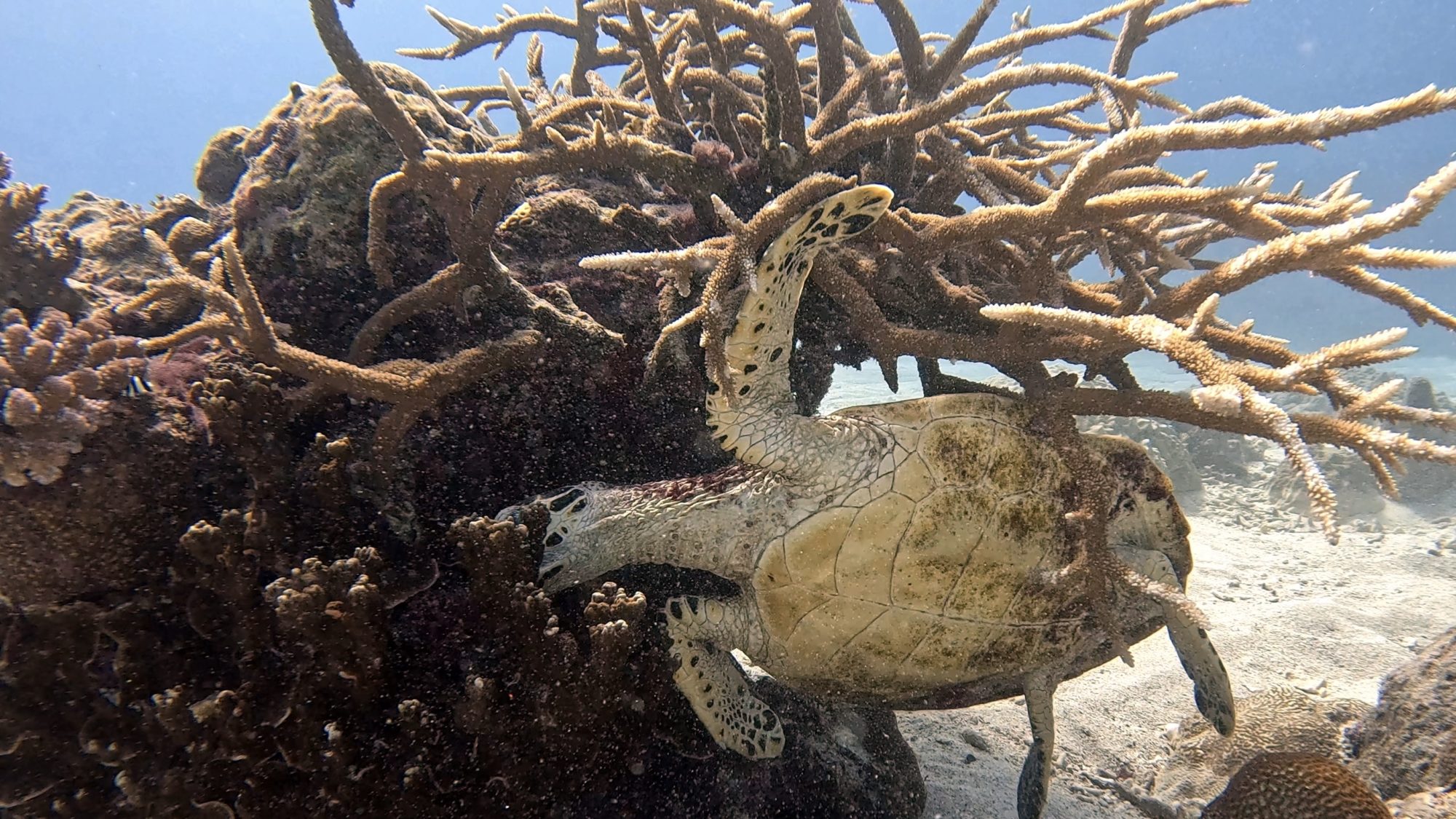 途中還遇到一隻玳瑁,為了吃海草努力把自己卡進珊瑚縫裡,模樣實在可愛。