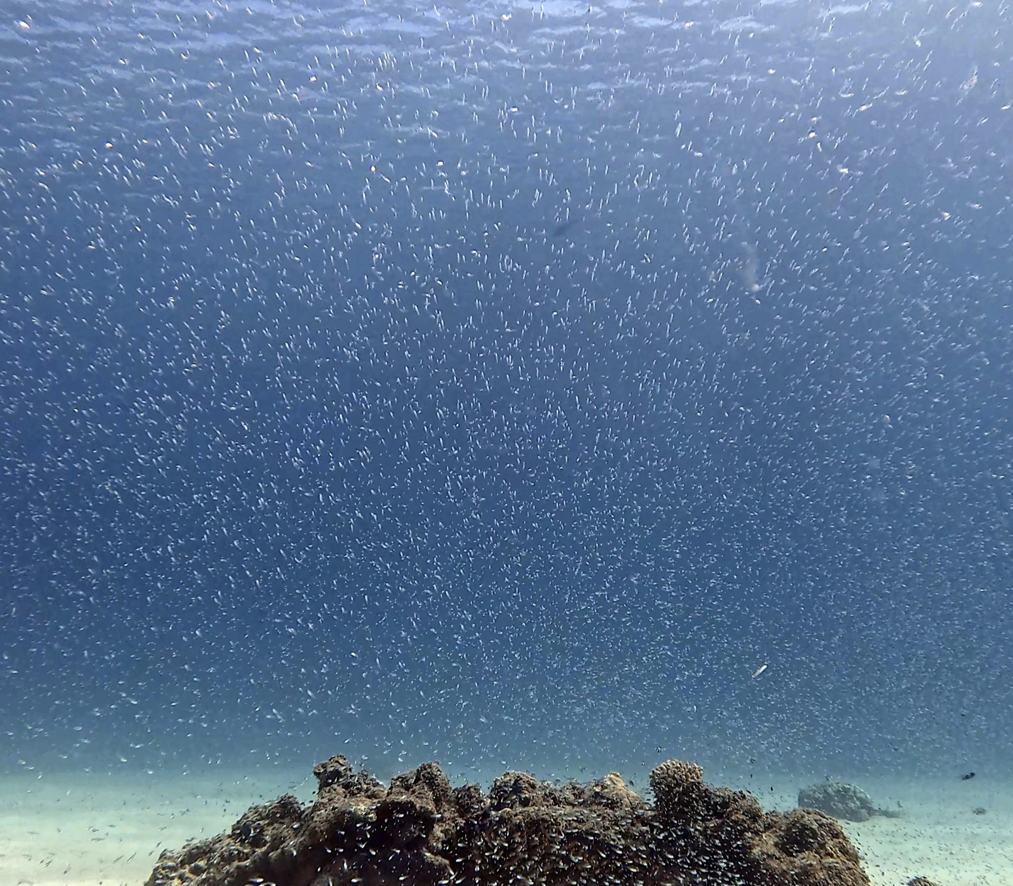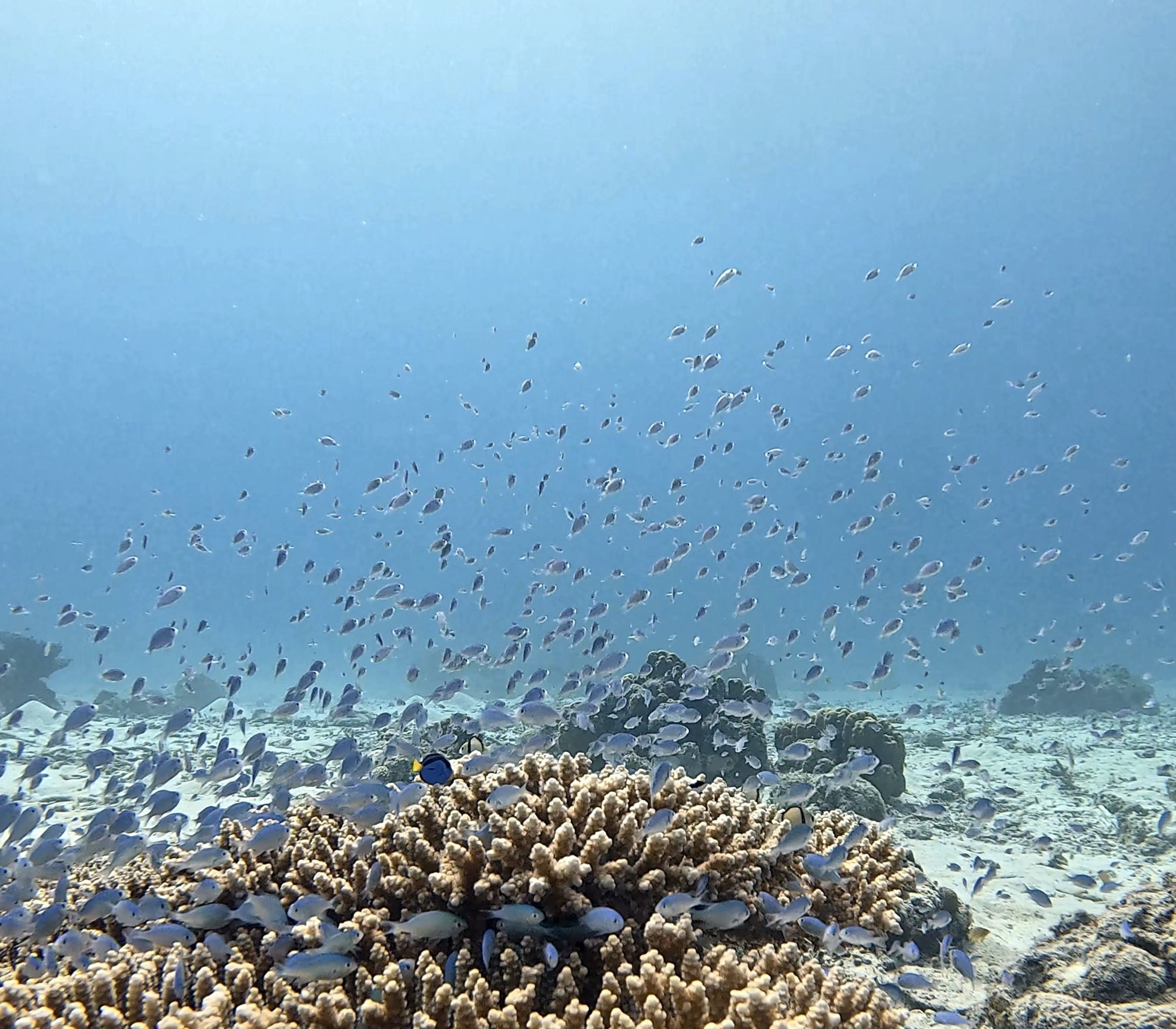 珊瑚礁上的藍綠光鰓雀鯛成群遊動,躲進珊瑚又探出頭的樣子非常可愛,裡面還藏著一隻小小的多莉寶寶。