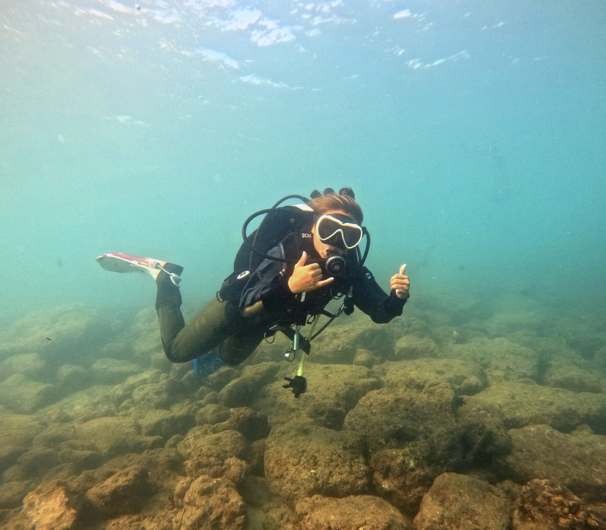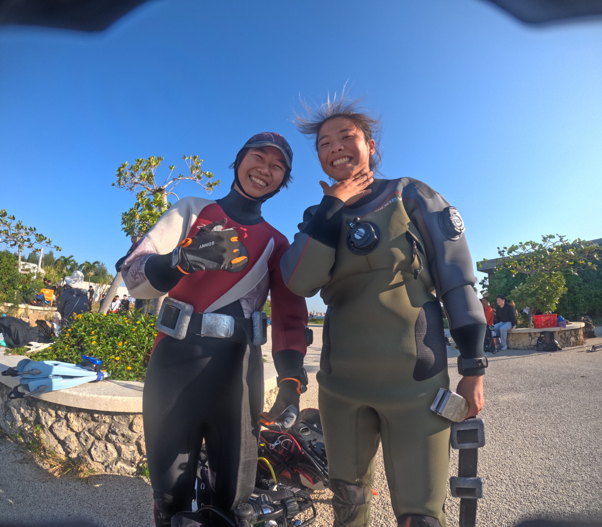雖然是12月,沖繩天氣超給力!氣溫25度,水溫23度,穿著乾衣完全不會冷,根本是溫暖潛水體驗。我們在水下主要複習了上課需要的各種技巧。