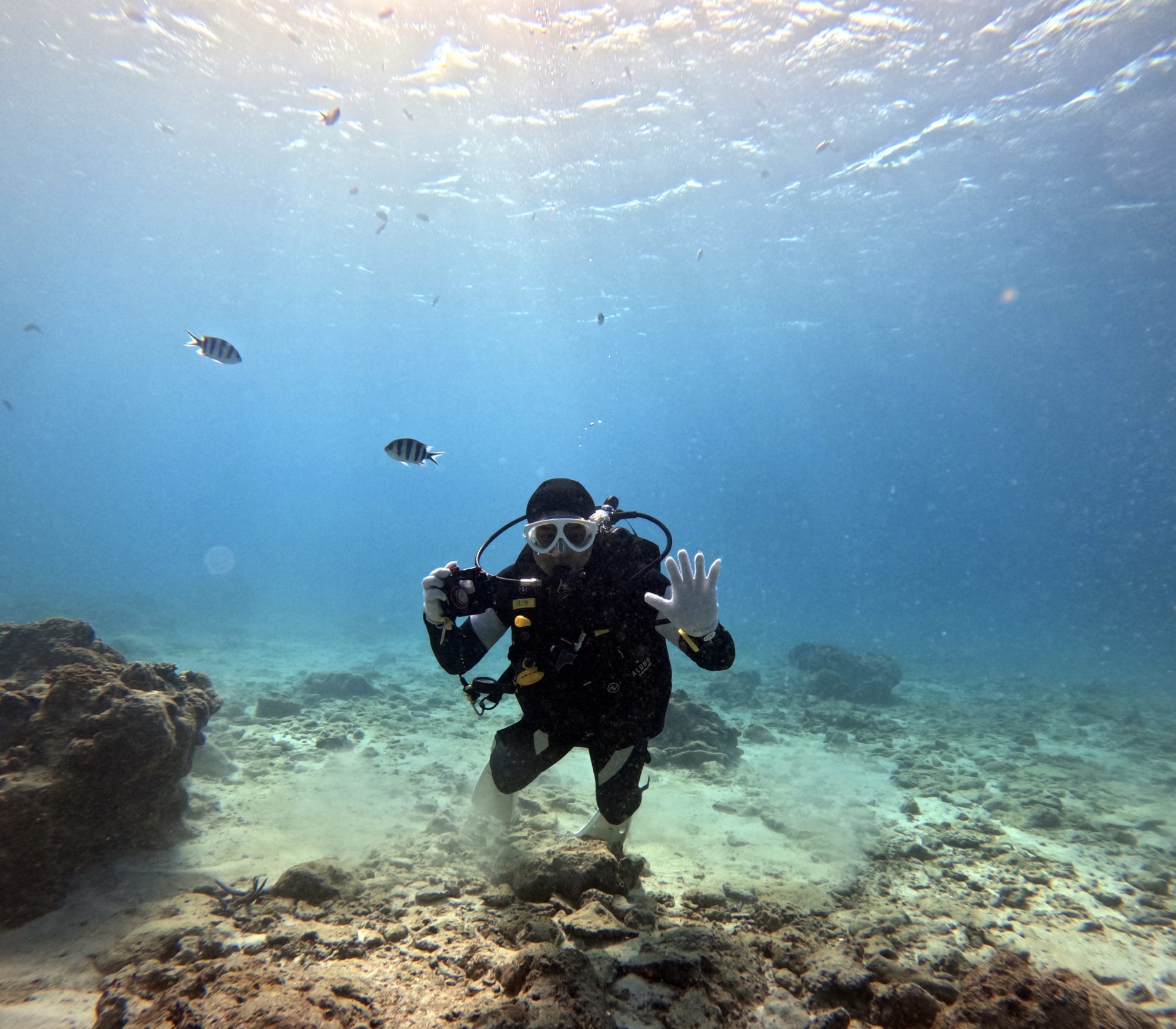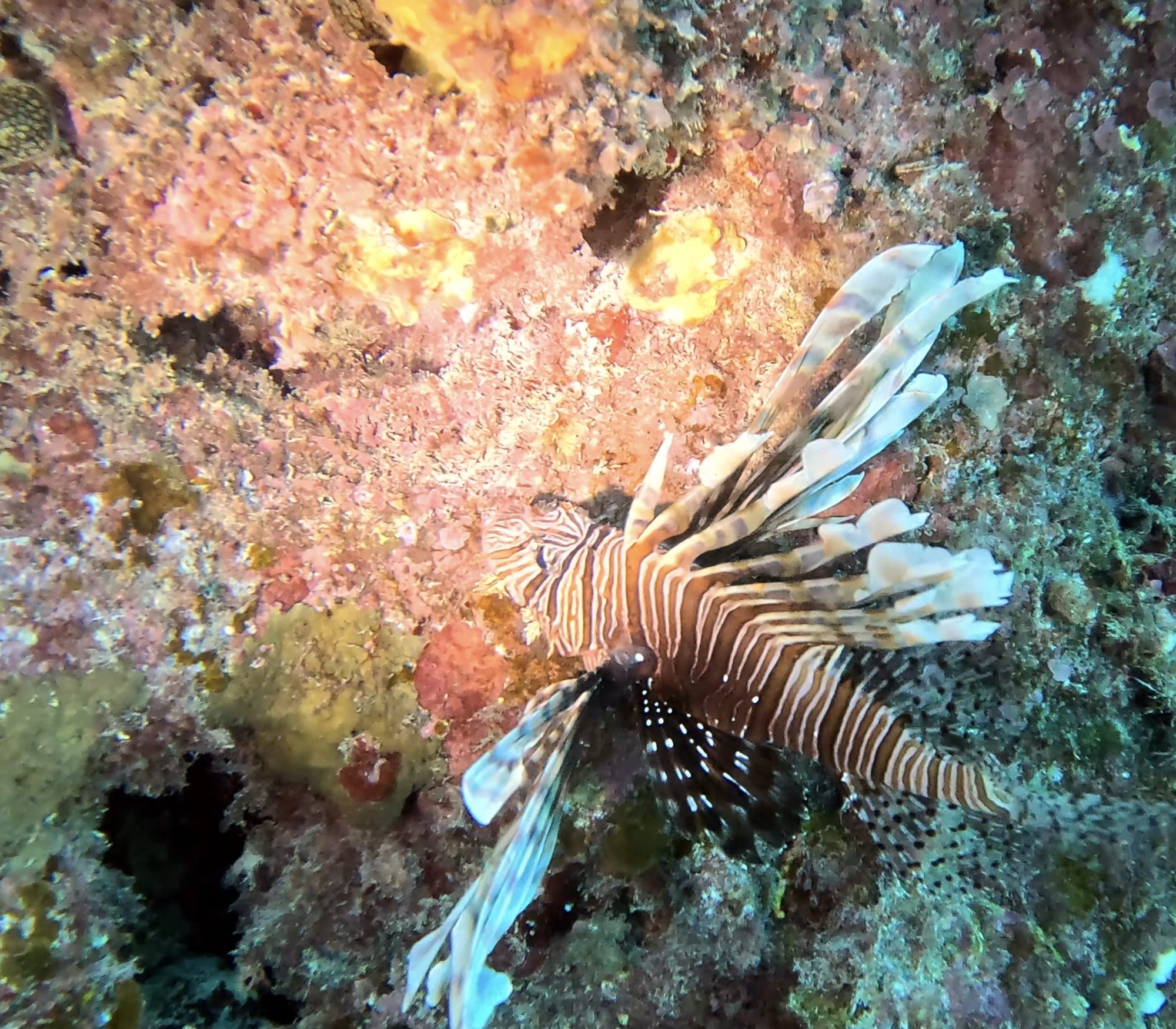 第二支我們去淺區,一入水就看到漂亮的獅子魚在發呆,接著被整群豆娘魚包圍到差點找不到路(笑)。最後回程在石縫裡發現星帶蝮鯖,小小一隻躲在那裡真的挺可愛的。