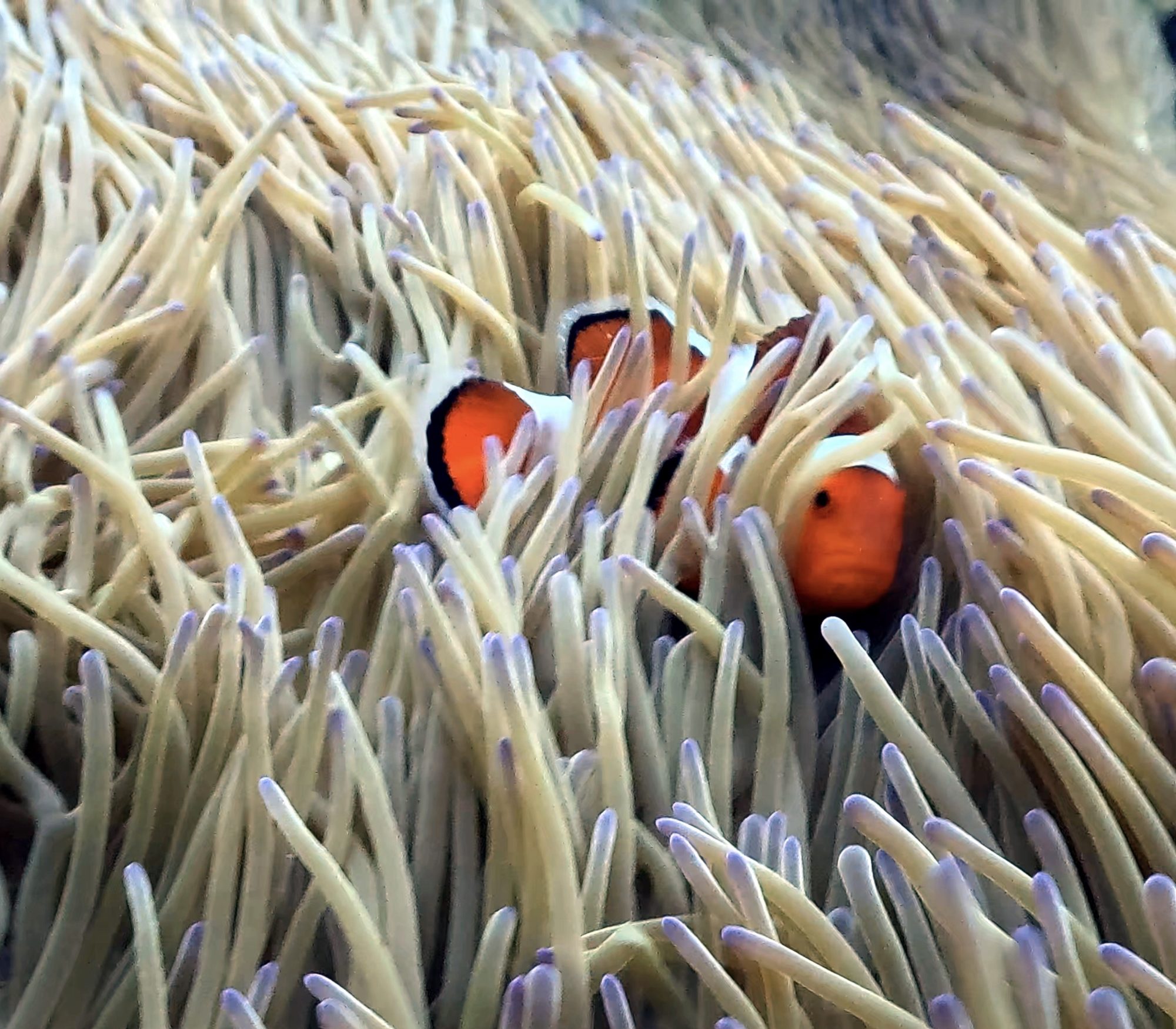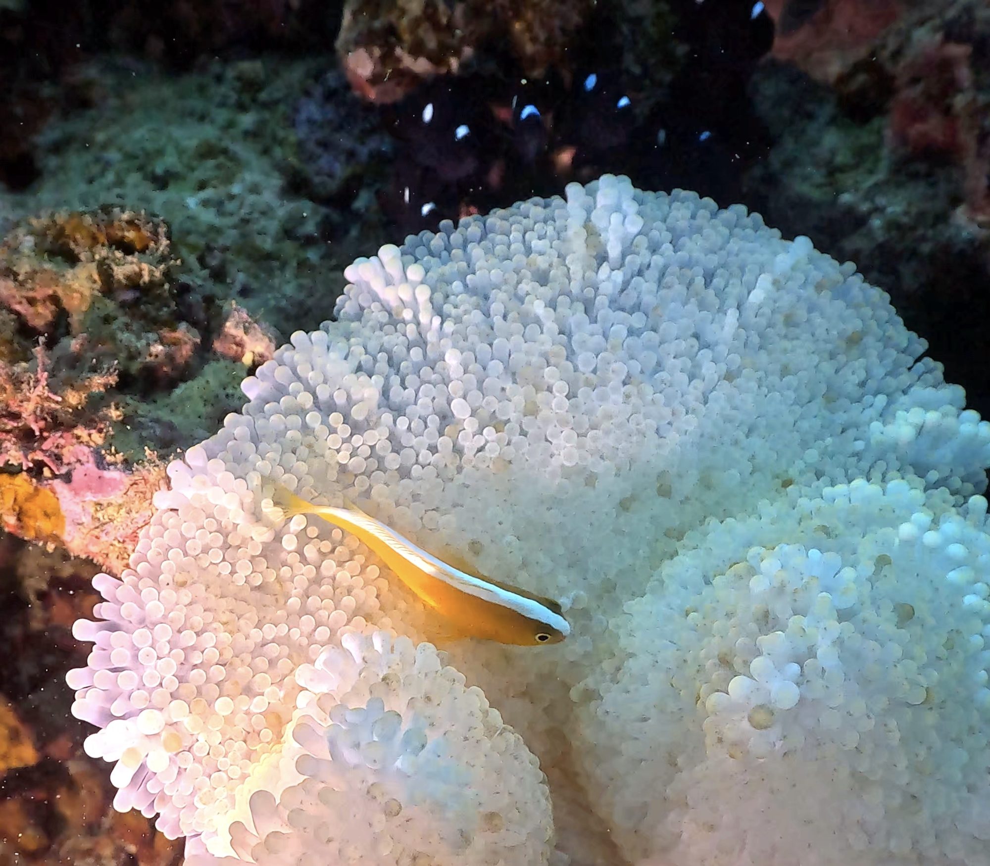 第二支去「Blue Stripe」,我們一口氣集滿了五種不同的小丑魚,礁岩上還有滿滿的雀鯛群。回程時在淺礁區欣賞了金帶齒頜鯛。雖然天氣很冷,但能來平常少去的潛點,也是很難得的新年體驗。