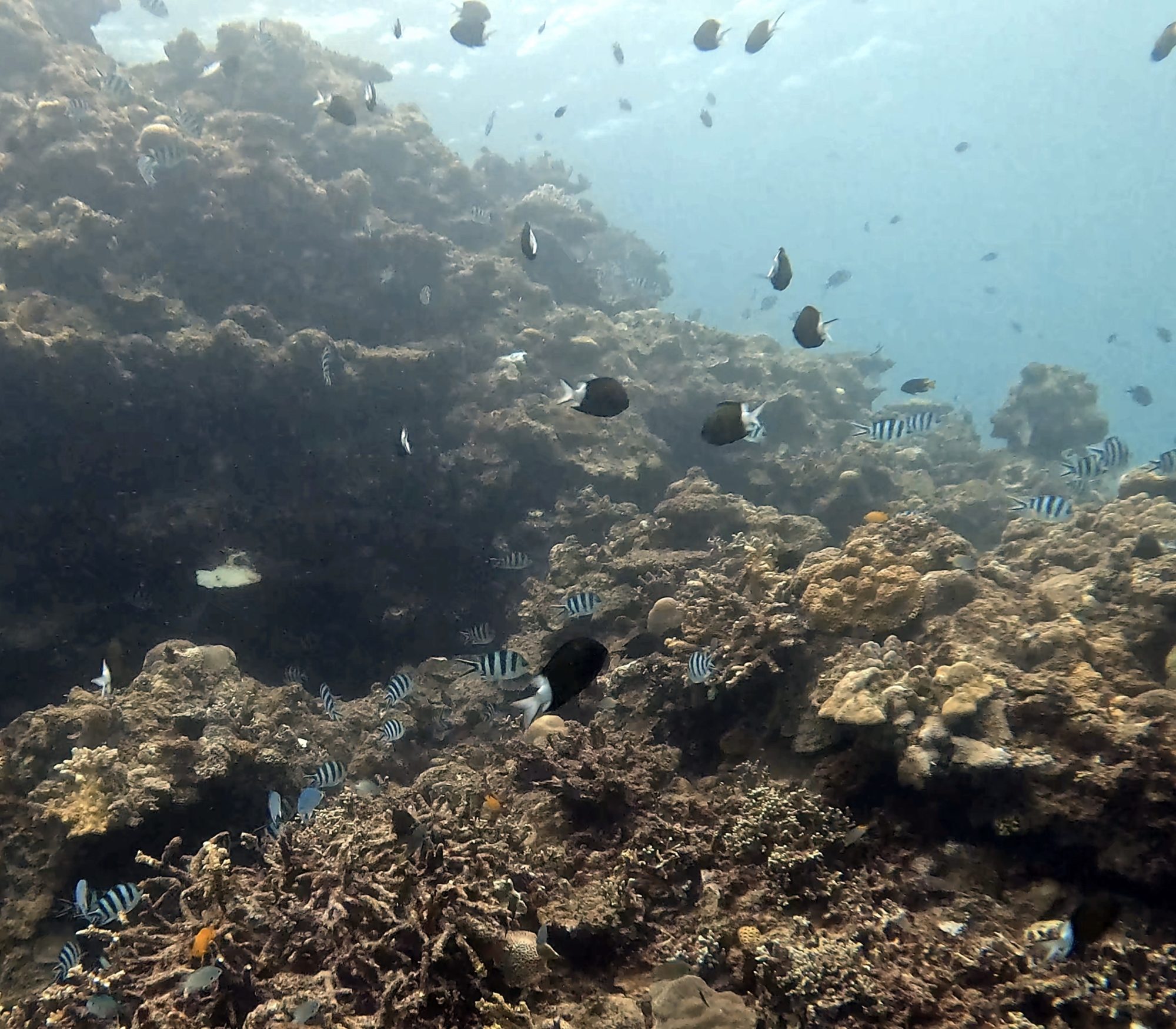 第一支在「Blue Three」,這裡有整片保育類的藍珊瑚,場面超級壯觀!我們繞過一個地形小走廊後,還看到一隻黑斑叉鼻魨趴在石頭上睡覺,模樣特別可愛。