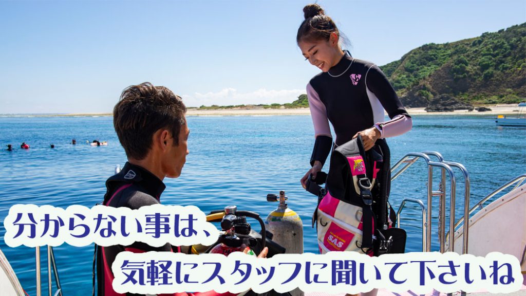 - 当店では安全管理のため、全てのお客様に「ダイブコンピューター」の装備をお願いしております。お持ちでない方はレンタル(1日1,100円税込)して頂きますので、ご理解とご協力をお願い致します。
