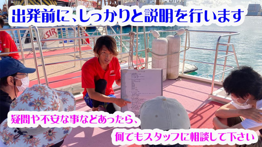出発前に1日の流れや船の使い方、注意事項、確認事項行います。慶良間に到着後、ダイビングポイントの説明や見所などオリジナルマップを使って、しっかり行います。潜る前に不安や気になることを解消できるので安心です。