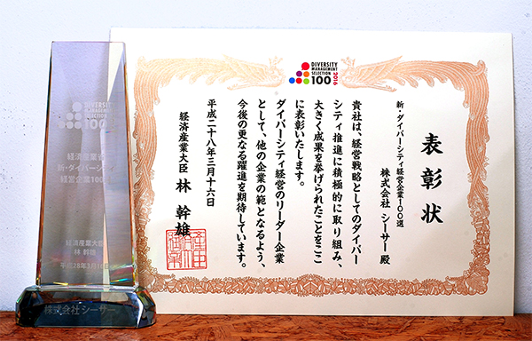 株式会社シーサーは、経済産業省が主催する平成27年度「新・ダイバーシティ経営企業100選」を、2016年3月16日に受賞しました。
